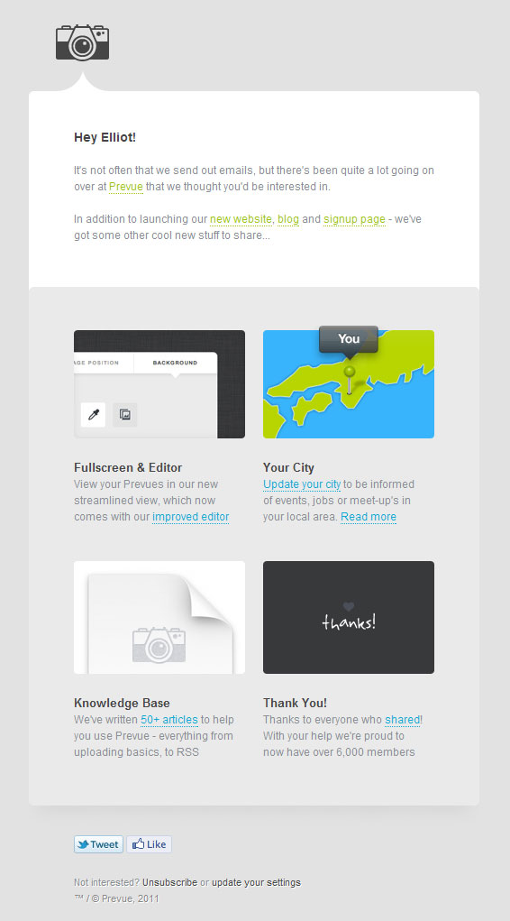 I’m a big fan of Prevue – it’s a service for designers to present their work to clients and collect feedback online – and their email newsletter is very nicely designed. There’s lots of white space, and short, no-nonsense copy. It’s easy to follow and keep up to date with the updates to their service.